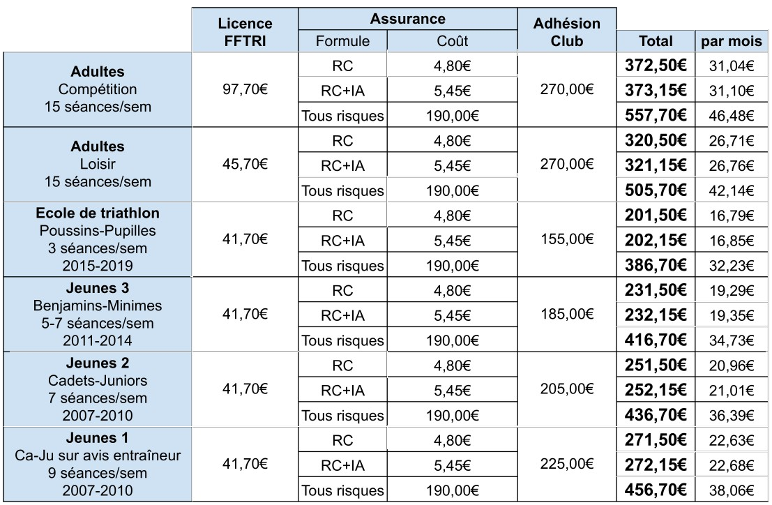 Le montant de l’adhésion annuelle comprend la cotisation club et la licence FFTRI. L’offre d’assurance est incluse dans votre licence FFTRI. Vous avez le choix entre 3 formules (Responsabilité Civile, RC+Individuelle Accident+Assistance, RC+IA+Dommages au vélo).